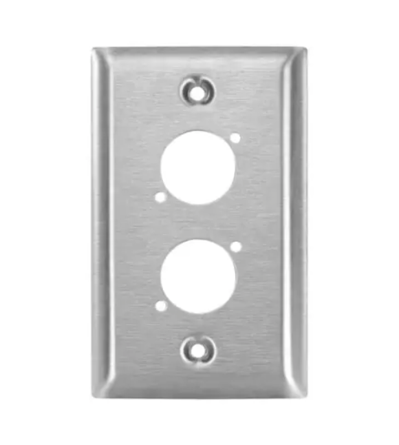One-gang stainless steel wall plate with hole punches for two Neutrik mic connectors.